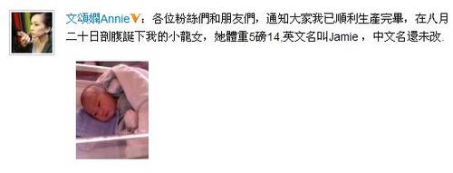 文頌嫻順利產(chǎn)女曬全家福 女兒Jamie僅4.7斤(組圖)