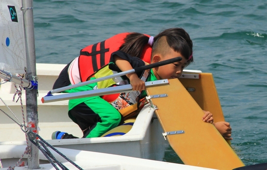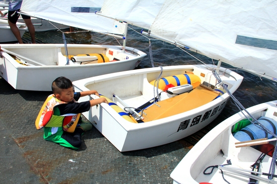 四歲的OP帆船小選手多多來(lái)自南京,這是他第一次揚(yáng)帆大海,之前的訓(xùn)練都在玄武湖里進(jìn)行