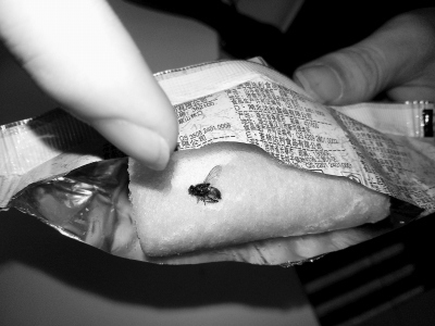 ????8月21日,市民陳女士反映:她從家附近的超市里買了一袋達(dá)利園瑞士卷蛋糕,其中一個(gè)蛋糕中竟有一只蒼蠅。