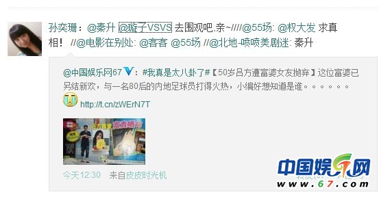 有網(wǎng)友看到中國娛樂網(wǎng)()一條關于呂方被甩富婆女友甩的新聞,隨即有網(wǎng)友爆料說是微博中名叫“璇子VSVS”的女人,該女性的微博介紹說是廣州某公司的總經(jīng)理。然而在中超廣州恒大隊員秦升的微博里,有秦升@璇子VSVS的內(nèi)容,公開稱對方為老婆。原來該女子是中超隊員秦升的老婆。