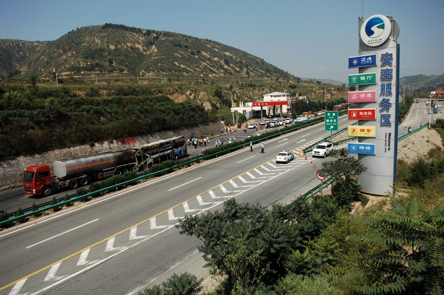 8月26日,交警在現(xiàn)場處置事故。據(jù)悉,發(fā)生事故的客車有39個座位,實坐旅客39人。目前事故現(xiàn)場的大火已撲滅,其中3人被送往醫(yī)院。事故原因正在調(diào)查之中。