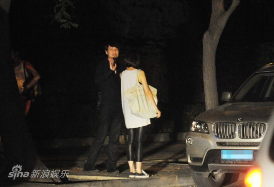 袁泉素雅白裙收工回家 與神秘文藝男路邊聊天