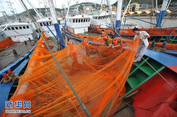 8月27日,在浙江省舟山市沈家門漁港,沈家門邊防派出所官兵在漁船上幫助漁民整理漁網(wǎng),做好防臺(tái)風(fēng)準(zhǔn)備工作。