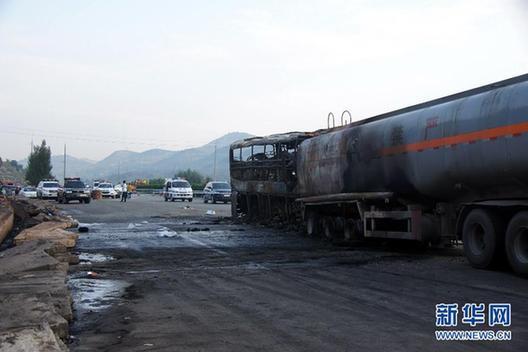 圖為包茂高速陜西延安境內(nèi)發(fā)生的特大交通事故現(xiàn)場(chǎng)(8月26日攝)。