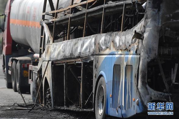 這是8月26日拍攝的事故現(xiàn)場(chǎng)。當(dāng)日凌晨2時(shí)許,陜西省延安市境內(nèi)的包茂高速公路安塞化子坪服務(wù)區(qū)南出口200米處,發(fā)生一起特大交通事故,一輛雙層臥鋪客車和一輛罐車(裝有甲醇)追尾,并致兩車起火,目前事故已造成36人死亡。據(jù)悉,發(fā)生事故的客車有39個(gè)座位,實(shí)坐旅客39人。事故發(fā)生后,有關(guān)部門領(lǐng)導(dǎo)迅速趕往現(xiàn)場(chǎng),組織展開全力施救,目前事故現(xiàn)場(chǎng)的大火已撲滅,其中3人被送往醫(yī)院。事故原因正在調(diào)查之中。新華社發(fā)