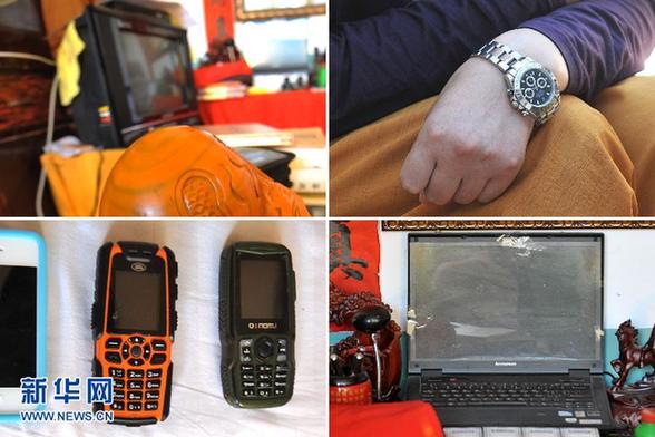 山西五臺(tái)山南山寺僧人伽行的電視機(jī)、手表、手機(jī)和筆記本(8月24日攝,拼版照片)。
