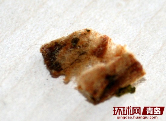 ????隨后,趙先生開始食用煮好了的面,“我感覺泡面里也有煙味,所以我就在碗中來回攪拌,結(jié)果發(fā)現(xiàn)了一塊‘牛肉丁’,散發(fā)著煙味。”趙先生表示,他將這塊“牛肉丁”挑出來撕開,發(fā)現(xiàn)其呈絲絮狀,內(nèi)部為深黃色,部分已經(jīng)發(fā)黑,煙油味很濃,“確定是香煙的過濾嘴,而且還是抽過的,真是太惡心了?!彪S后,趙先生又把方便面包裝袋拿過來一聞,沒有聞到煙味,而調(diào)料包里的煙味卻很濃,他認(rèn)為過濾嘴就是被包裝在調(diào)料包里的。