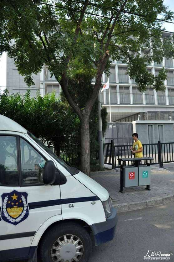 2012年8月28日下午,一輛警車停放在日本駐華大使館正門外西側(cè)。當(dāng)日,北京警方加強(qiáng)了對日本駐華大使館官邸的保護(hù)。