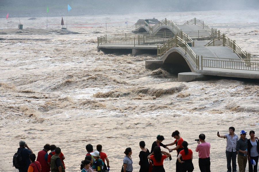 8月29日,黃河壺口瀑布景區(qū)主副瀑布連成一片,形成特大瀑布群。由于受上游降雨增多,黃河晉陜峽谷上游開閘泄洪,雖然汛期已過,但水位再次上漲,水流量增加到每秒4000多立方米,是去年同期的一倍左右,壺口瀑布形成長達300多米的特大瀑布群。