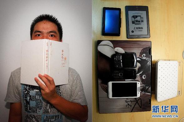 孫仕鈞和他為大學(xué)生活準(zhǔn)備的電子“裝備”(拼版照片,8月30日攝)。孫仕鈞是中國科學(xué)技術(shù)大學(xué)2012級(jí)大一新生,今年18歲,來自海南瓊海,就讀于中科大管理學(xué)院。