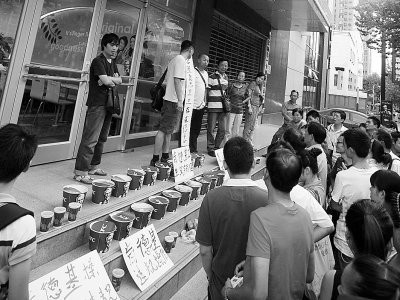????圖為男顧客正在肯德基店前堵門抗議 記者楊濤 攝