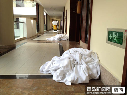 ????當(dāng)記者來到入住的房間后,卻發(fā)現(xiàn)房間并未收拾,上一波客人走后留下的垃圾還在地上,床鋪也是凌亂不堪。房間門口還堆著一地等待清洗的床單被罩。記者一行只好抱著行李繼續(xù)站在房間門口等待,期間并沒有任何工作人員詢問記者是否需要幫助。再等待半個小時之后,酒店工作人員才將房間打掃完畢,此時已是下午4點20分。