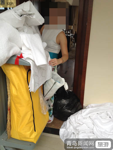 ????此時,一位穿著正規(guī)工作服的推著一輛裝滿清潔用品的工作人員又來到房間門外,經(jīng)過交談才得知,房間內(nèi)那兩個身著便服的也是酒店的工作人員,而此時又有一位身著藍(lán)色工作服的酒店工程部工作人員進(jìn)入房間,和負(fù)責(zé)專職打掃衛(wèi)生的工作人員一起打掃。