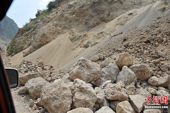 9月8日,云南彝良地震震中洛澤河鎮(zhèn)附近道路上,不斷發(fā)生的余震引發(fā)山體落石。截止8日早上8時(shí),云南彝良地震災(zāi)區(qū)發(fā)生余震161次,最大余震4.4級(jí)。圖為余震引發(fā)山體落石,揚(yáng)起大量灰塵。