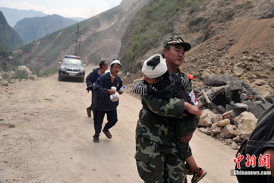 9月8日,參與云南彝良地震救援的武警官兵將受傷的兒童安全區(qū)域轉(zhuǎn)移。劉冉陽 攝