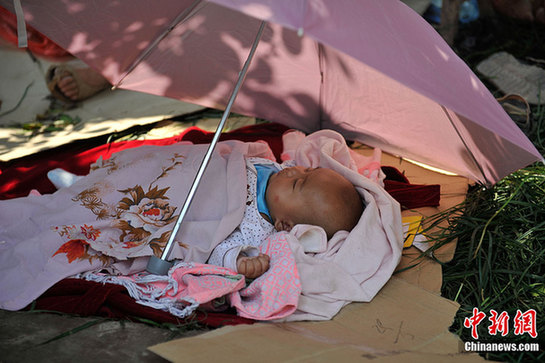9月8日,云南彝良地震震中民眾逐步向安全區(qū)域轉(zhuǎn)移。據(jù)不完全統(tǒng)計(jì),截至目前云南彝良地震已經(jīng)造成了80人死亡,795人受傷,有74.4萬人受災(zāi)。圖為安置點(diǎn)內(nèi)熟睡的兒童。劉冉陽攝