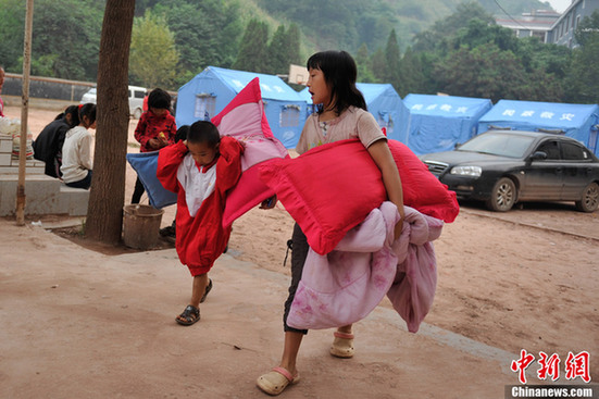 9月8日清晨,云南彝良地震震中所在地洛澤河鎮(zhèn)。該鎮(zhèn)毛坪中學(xué)是此次地震災(zāi)區(qū)一個(gè)重要的民眾安置點(diǎn)。洛澤河鎮(zhèn)政府稱,9月7日中午發(fā)生的地震已經(jīng)造成該鎮(zhèn)49人遇難。圖為正在搬運(yùn)被褥的兒童。劉冉陽 攝