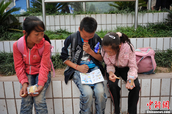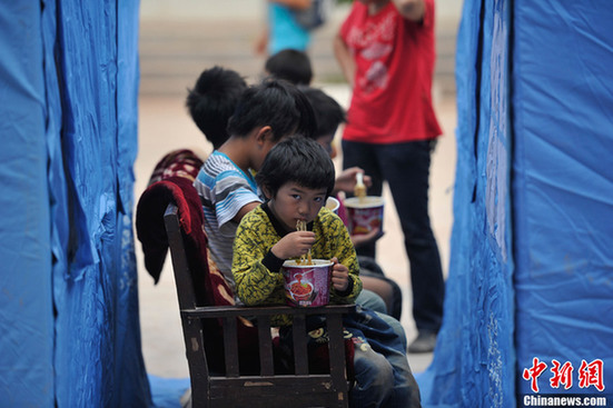 9月8日清晨,云南彝良地震震中所在地洛澤河鎮(zhèn)。該鎮(zhèn)毛坪中學(xué)是此次地震災(zāi)區(qū)一個(gè)重要的民眾安置點(diǎn)。洛澤河鎮(zhèn)政府稱,9月7日中午發(fā)生的地震已經(jīng)造成該鎮(zhèn)49人遇難。圖為正在帳篷外吃方便面的兒童。劉冉陽 攝