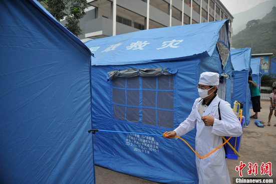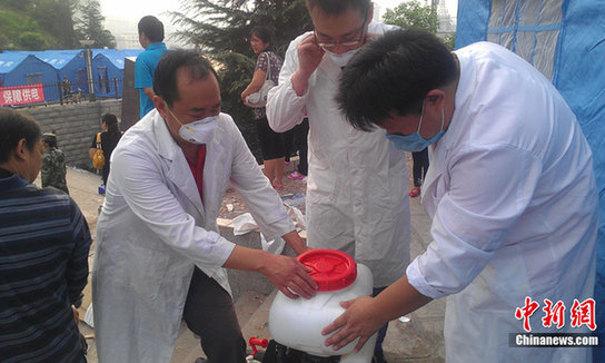 9月8日清晨,云南彝良地震震中所在地洛澤河鎮(zhèn)。該鎮(zhèn)毛坪中學(xué)是此次地震災(zāi)區(qū)一個(gè)重要的民眾安置點(diǎn)。洛澤河鎮(zhèn)政府稱,9月7日中午發(fā)生的地震已經(jīng)造成該鎮(zhèn)49人遇難。圖為洛澤河鎮(zhèn)衛(wèi)生院的醫(yī)生開始進(jìn)行消毒防疫工作。劉冉陽攝