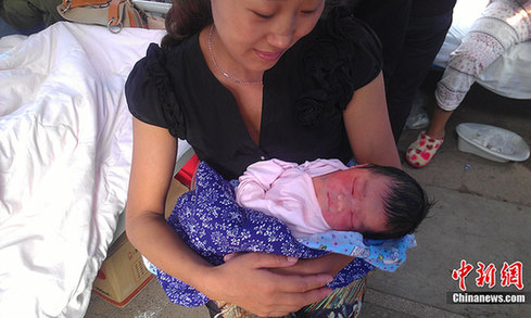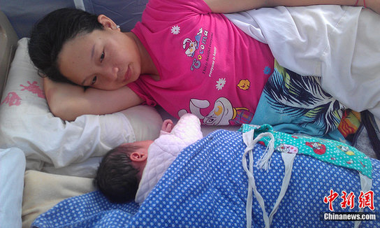 9月8日清晨,云南省彝良縣人民醫(yī)院,這里是此次地震的災(zāi)民安置點(diǎn)之一。圖為8日凌晨在帳篷中出生的嬰兒躺在母親身邊。中新社發(fā)顧一行 攝