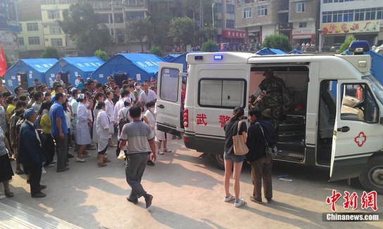 9月8日清晨,云南省彝良地震中的傷員被送往縣人民醫(yī)院進(jìn)行救治。目前,該院已收治81名地震傷員,多為頭顱外商、骨折。中新社發(fā)顧一行 攝