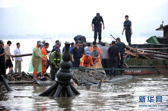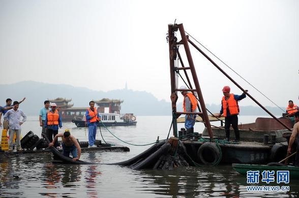 西湖風(fēng)景名勝區(qū)管委會(huì)的工作人員以及水上派出所民警正駕駛船只對(duì)亭子的頂子進(jìn)行打撈。