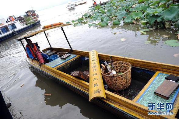 9月12日,西湖景區(qū)工作人員打撈上來的原本懸掛于集賢亭的牌匾。