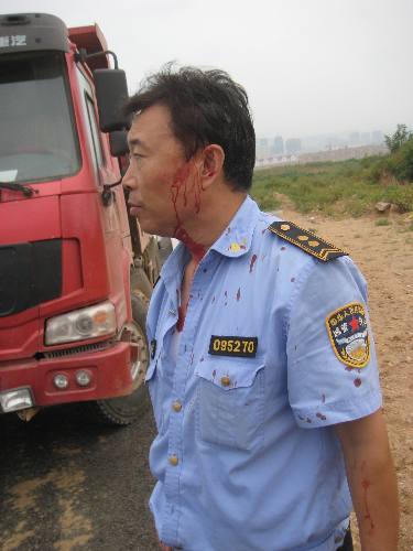 ????令人沒想到的是,被查大貨司機不但拒不配合調(diào)查,還叫來一幫社會人員阻撓執(zhí)法,想強行開走違法車輛。其中有一名七十多歲的老人情緒激動,推搡執(zhí)法人員并躺在地上,稱被執(zhí)法人員毆打。其他幾名身份不明的人員手持棒球棍、警用電擊棍、警用甩棍等器械追打城管執(zhí)法人員,將2名執(zhí)法人員打傷,其中一名執(zhí)法人員頭部受傷,鮮血直流。執(zhí)法人員立即撥打了110報警,警察隨后趕到現(xiàn)場,將幾名打人者控制。案件現(xiàn)正在調(diào)查處理過程中。