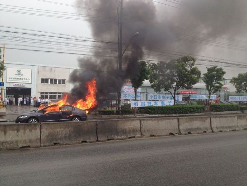 9月13日,上海江楊北路東風(fēng)本田店門口一車主自己燒毀一輛本田思域,并拉起有反日、保釣內(nèi)容的橫幅,致使江楊南路南向北暫時封閉,消防車隨后趕到。