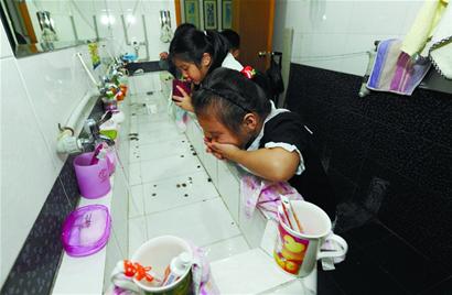 晚上7時(shí)吃過(guò)睡前甜點(diǎn)后,孩子們開(kāi)始洗漱準(zhǔn)備上床睡覺(jué)了。記者看到,每個(gè)孩子都是自己拎著洗漱的小籃子,到水龍頭前接水刷牙、洗臉,然后再將洗漱用品拿回宿舍,整個(gè)過(guò)程老師只是在一邊看著,完全不用動(dòng)手?!霸诩依锏臅r(shí)候都是媽媽給我洗臉、刷牙,現(xiàn)在我長(zhǎng)大了,自己能刷牙了?!?歲的許浩驕傲地說(shuō)。