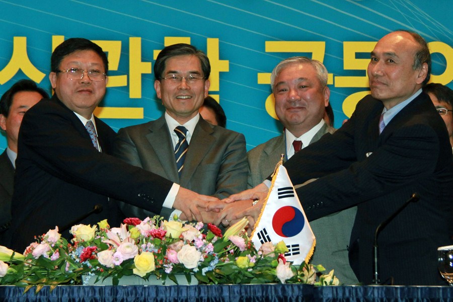 2011年12月16日,韓國平昌,中國國際貿(mào)易談判副代表崇泉(左一)、韓國外交通商部自貿(mào)協(xié)定談判代表崔晳泳(左二)和日本外務(wù)省外務(wù)審議官西宮伸一(右二)簽署聯(lián)合聲明后握手。新華社/何璐璐