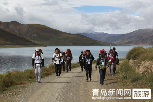 裁判員一聲令下,10名選手負重沿著圣潔美麗的羊卓雍錯徒步比賽。比賽剛開始,不像大家想象的選手們會飛奔出去,他們必須根據(jù)自己的體能和適應能力來調整速度,協(xié)調團隊策略性的前進,尤其還要照顧好本隊的女性隊員。前兩公里兩組隊員都沒有拉開較大差距。到達6公里處時,已經明顯拉開較大差距,來自大連的一名選手領先第二梯隊大約80米左右。來自青島賽區(qū)