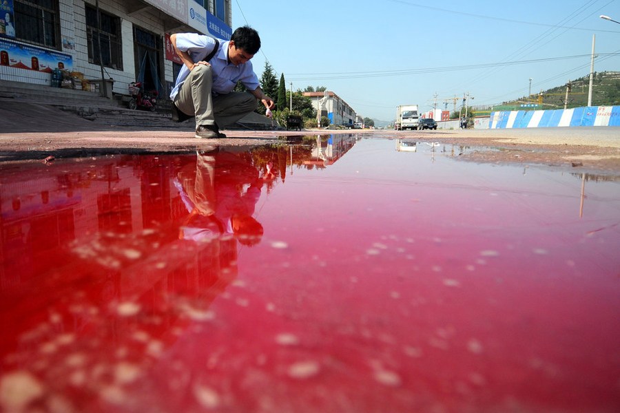 近日,山東省濟(jì)南市,一村莊似遭紅色污染,一夜之間路面均變成了紅色。據(jù)悉是因?yàn)楦咚俾飞弦惠v車(chē)上掉下來(lái)一袋子化學(xué)品,正好落在了高速路下的一間汽修廠(chǎng)內(nèi)。經(jīng)多部門(mén)及時(shí)行動(dòng)查出了村莊被染紅的“元兇”為堿性玫瑰精。圖為路面淌著紅色的水。