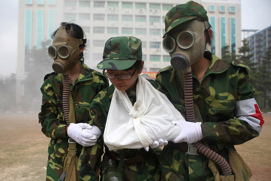 2012年9月24日,正在深圳警備區(qū)預(yù)備役防化團(tuán)軍訓(xùn)的深圳大學(xué)2012屆新生舉行軍訓(xùn)會(huì)操表演。模擬火宅現(xiàn)場(chǎng)中,頭戴防毒面具的救護(hù)員正在救助傷員。