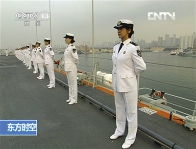 女性艦員在遼寧艦上站坡。據(jù)該艦政委介紹,遼寧艦上配備了將近5%的女性艦員。央視截圖