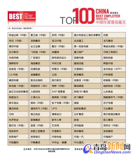 ????青島新聞網(wǎng)訊? 2012年9月25日,國(guó)內(nèi)知名人力資源機(jī)構(gòu)智聯(lián)招聘聯(lián)合北京大學(xué)企業(yè)社會(huì)責(zé)任與雇主品牌傳播研究中心舉辦的“中國(guó)年度最佳雇主(2012)”(以下簡(jiǎn)稱“最佳雇主”)活動(dòng)在經(jīng)過多重評(píng)選后,正式公布了“中國(guó)年度最佳雇主提名雇主100強(qiáng)”名單。據(jù)悉:此次“最佳雇主”報(bào)名成功的企業(yè)共有1554家,進(jìn)入百?gòu)?qiáng)的比例為15:1。