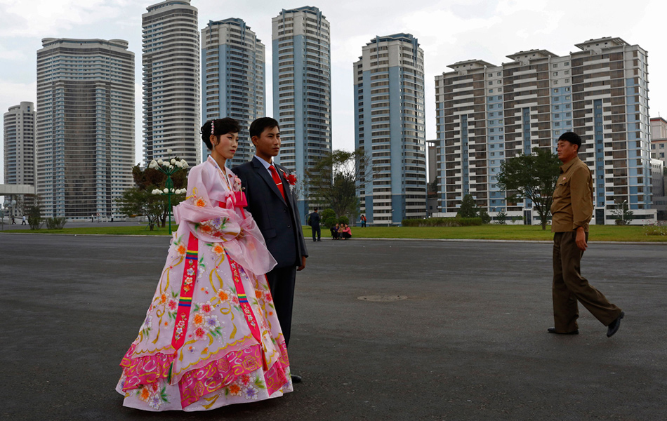 2012年9月19日,朝鮮平壤,萬壽山開發(fā)新區(qū)內(nèi),一對新人在拍攝婚紗照。Vincent Yu/攝