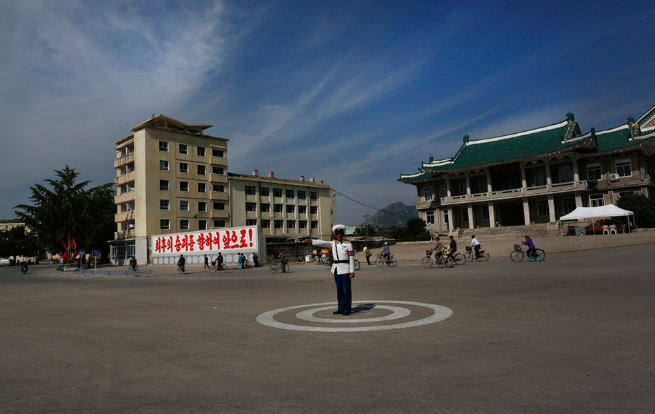 2012年9月21日,朝鮮開(kāi)城,馬路中央指揮交通的交警。Vincent Yu/攝