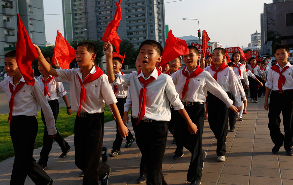 2012年9月24日,平壤,高唱愛(ài)國(guó)歌曲列隊(duì)走過(guò)街頭的少年。Vincent Yu/攝