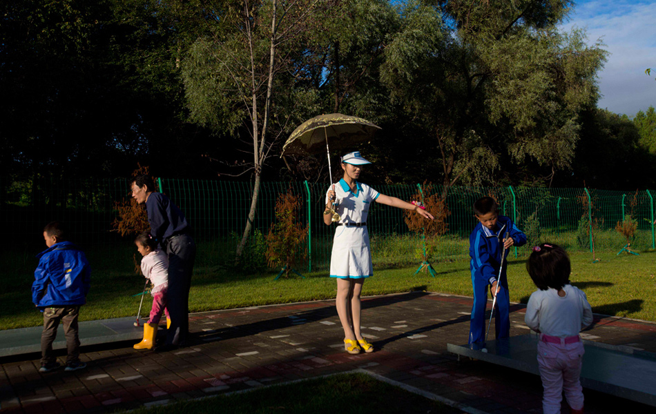2012年9月8日,平壤一處迷你高爾夫球場(chǎng)內(nèi),一名工作人員指導(dǎo)孩子們打球。 David Guttenfelder/攝