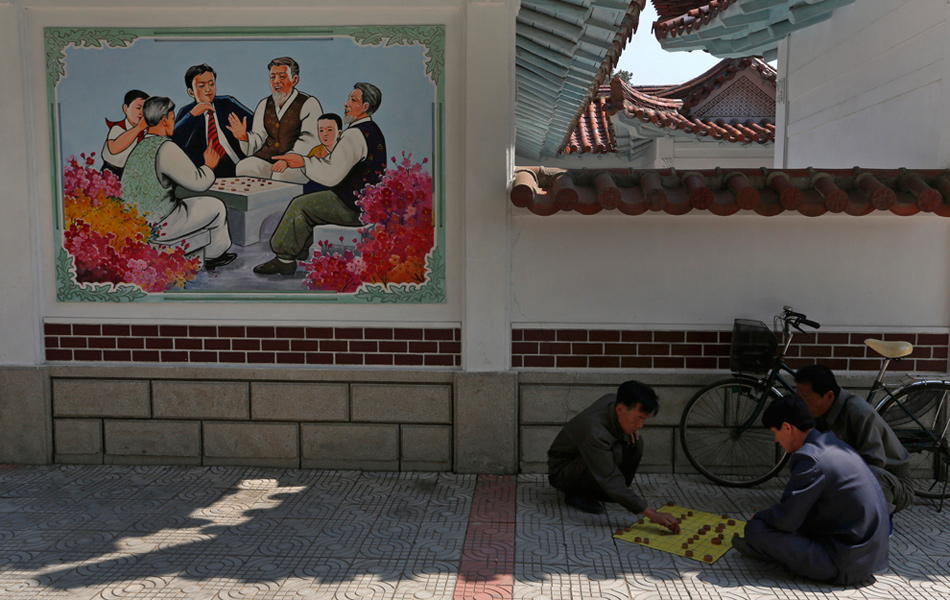 2012年9月23日,朝鮮西部城市沙里院,3名男子蹲坐在街頭下象棋。Vincent Yu/攝