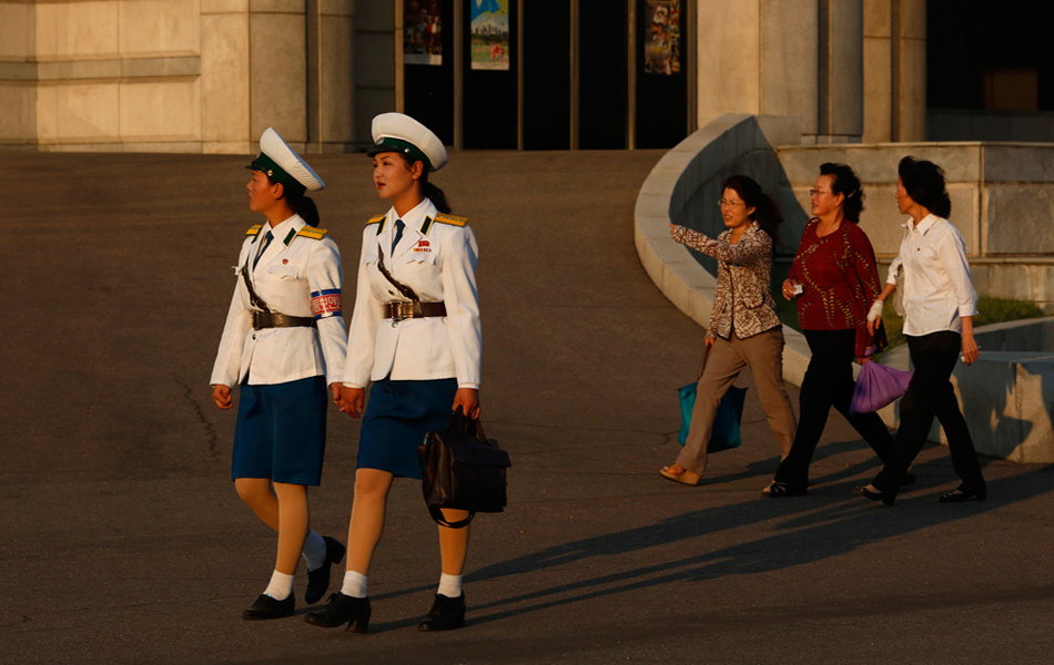 2012年9月22日,朝鮮平壤,兩名女交警手拉手走過(guò)街頭。Vincent Yu/攝