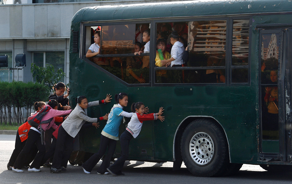 2012年9月20日,朝鮮平壤,孩子們推動(dòng)著街頭的一輛公車行進(jìn)。Vincent Yu/攝