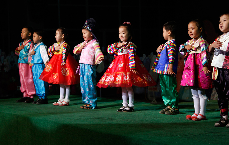 2012年9月19日,平壤青年活動中心大禮堂內(nèi),孩子們在朝鮮傳統(tǒng)服飾展覽會開幕式上表演。Vincent Yu/攝