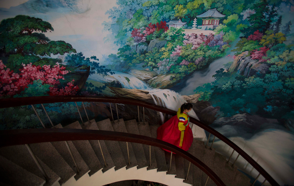 2012年9月11日,朝鮮開(kāi)城,一個(gè)專門(mén)面向游客開(kāi)放的飯店內(nèi),一名身著民族服飾的女子走下樓梯。David Guttenfelder/攝