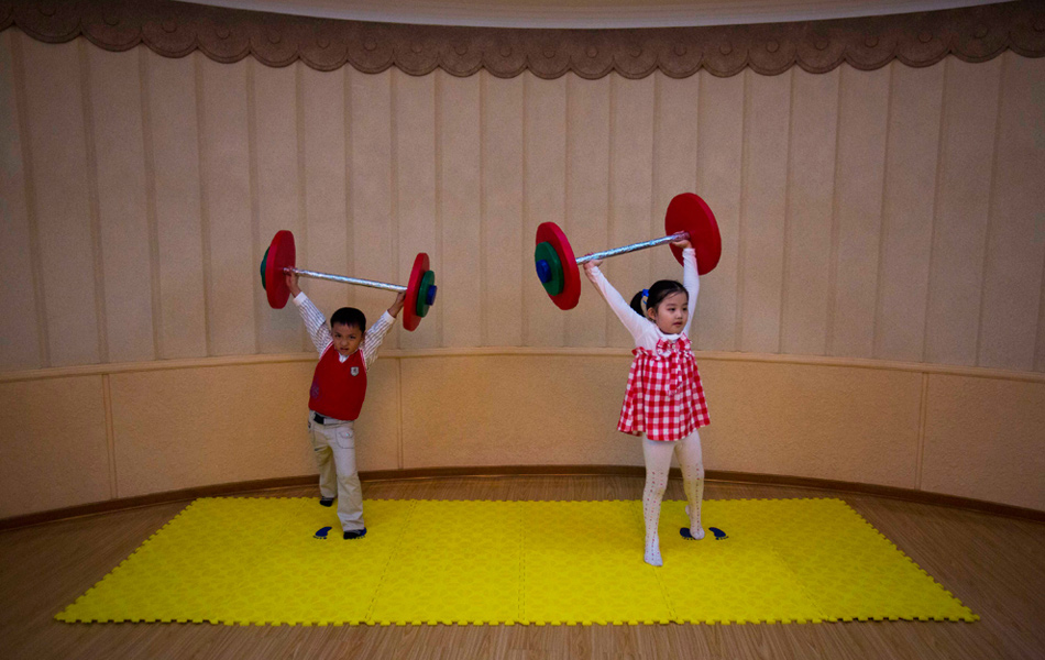 2012年9月13日,平壤一所學(xué)校內(nèi),兩名孩子舉著玩具杠鈴表演。David Guttenfelder/攝