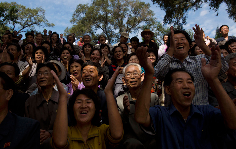 2012年9月14日,平壤,年度錦標(biāo)賽開幕式上,觀眾觀看傳統(tǒng)的摔跤比賽。David Guttenfelder/攝