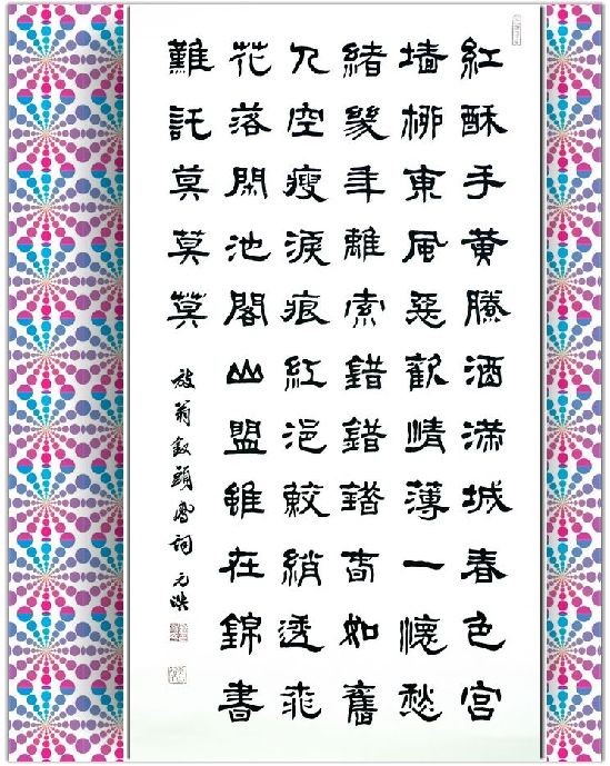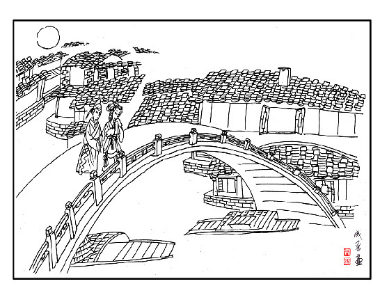 ????陸園也是張燈結(jié)彩,早有親友聚集等待?!霸瓶澙@玉成鸞鳳偕秦晉,紫氣升騰共慶鶯燕譜新曲”、“ 皓月描來雙影雁,寒霜映出并頭梅”。大喜之日,不少親友都攜對(duì)聯(lián)來賀,金粉鋪底,筆走龍蛇,遣詞造句各出新意。最中陸游心儀的是“日麗風(fēng)和桃李笑,珠聯(lián)璧合鳳凰飛”兩句,拜過天地入洞房時(shí),還貼耳與唐婉私語:“男兒自當(dāng)西北望,不知鳳凰飛何處?”唐婉順口答道:“自是東南飛了?!痹捯怀隹?,自覺失言。好在親友嬉笑,人聲嘈雜,陸游沒聽清楚,唐婉也就沒再入心。