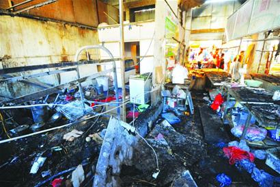 記者看到,這個(gè)肉食區(qū)由三間大房子組成,共約120平方米。據(jù)市場(chǎng)的一名攤主介紹,這個(gè)肉食區(qū)內(nèi)共有五個(gè)賣生豬肉的攤位。在這三間房子旁邊,是一個(gè)賣豬頭肉的門店,面積約30平方米,一堵由纖維板制作的“臨時(shí)墻”將它與肉食區(qū)隔開,但在大火中,這堵“臨時(shí)墻”被燒得殘缺不全,將肉食區(qū)跟這個(gè)豬頭肉店串通起來(lái)。據(jù)介紹,最先起火的地方就是這個(gè)豬頭肉店。
