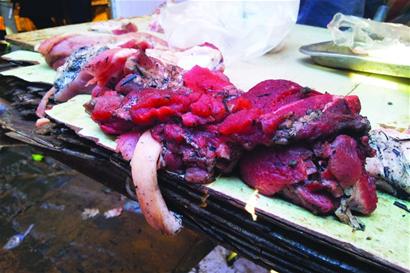 “這些大塊的肉被烤得不嚴(yán)重,回家洗洗照樣吃,那些肉之所以要切成肉丁,是因?yàn)楸砥ざ急粺沽?,論塊賣根本就沒人要,只能把表皮都切掉,將剩下的切成小塊出售。沒著火前,我賣12元一斤,現(xiàn)在這種大塊的7元一斤,肉丁5元一斤。 ”這名攤主說,這些肉都是他節(jié)前儲(chǔ)備的,本來(lái)打算在黃金周期間大賺一筆,沒想到全讓這場(chǎng)大火給攪和了。